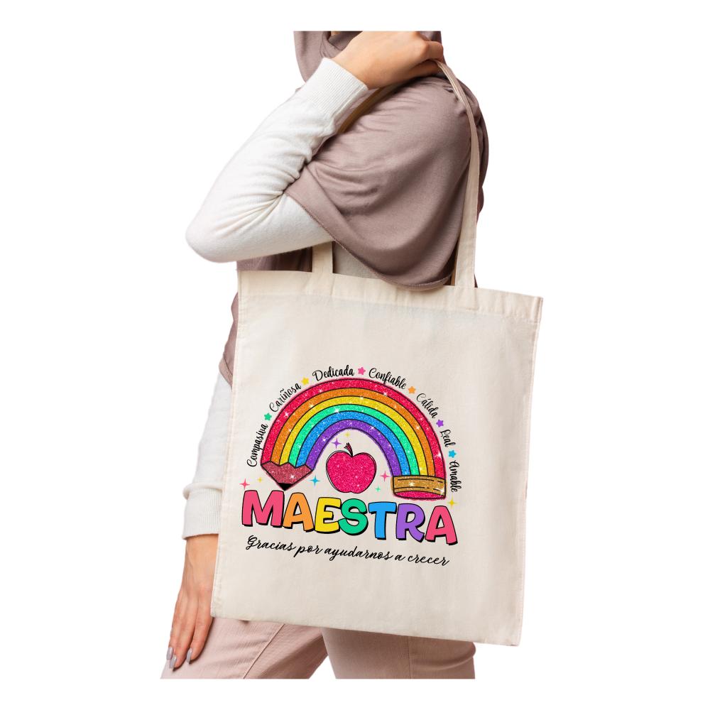 - Bolsa con frase: Perfecta para llevar libros, papeles o cualquier cosa que necesite. Además de ser funcional, lleva un mensaje que le recordará lo especial que es.